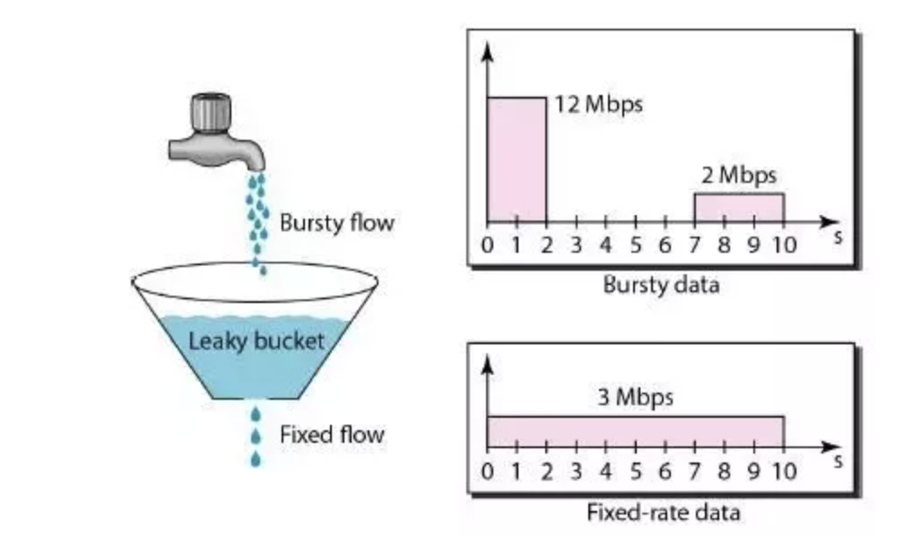 leaky bucket 방식은 output rate를 smooth하기 위한 방식이다. input rate가 들쑥날쑥이어도, output rate는 stable하다.
