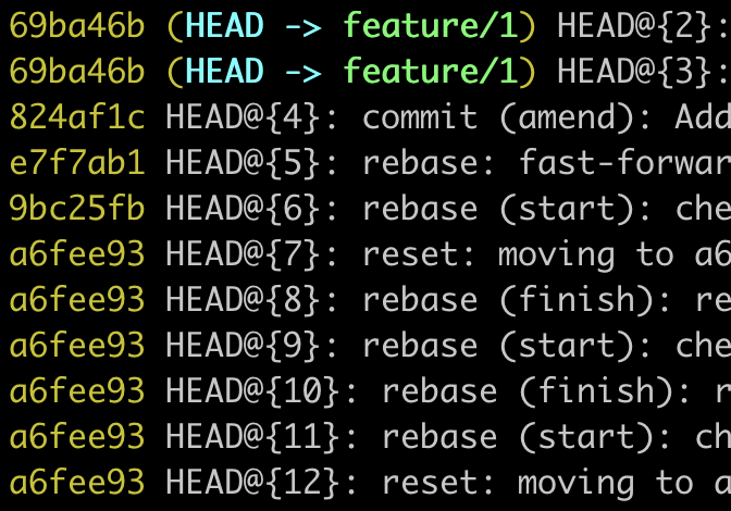 reflog,cherry-pick,reset이 요긴하게 쓰인다.git reflog는 그야말로 치트키이다. git 관련 내가 했던commit,merge,rebase,cherry-pick,reset, 브랜치 바꾸기 등의 기록을 다 보여준다. 다음은git reflog화면이다. 내가 스크린샷을 찍기 위해서 이런 저런 실험을 해보고 변경한 과정이 다 나타나있다. commit id를 확인할 수 있기 때문에reset과cherry-pick등을 할 때 편리하다.