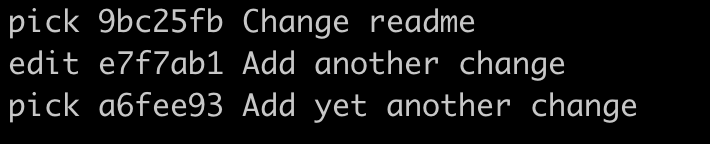 git rebase --interactive를 사용하면 A, B, C를 수정할 수 있다. (단,rebase는 타겟 브랜치를 설정해줘야 한다. 특정한 브랜치과 비교하여 현재 브랜치가 가지고 있는 변경 사항이rebase를 하는 대상이 된다.)git rebase -i를 하면 다음과 같은 화면이 뜬다.