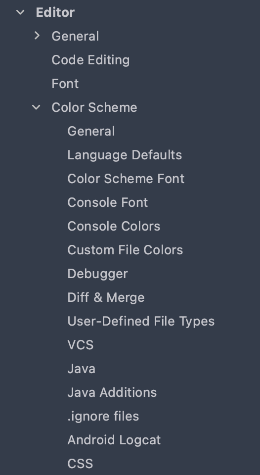 그런데 역시 Intellij는 나의 고민을 해결해줄 기능을 가지고 있었다. Preferences > Editor > Color Scheme에 들어가면 각 요소별로 색깔을 지정할 수 있다.
