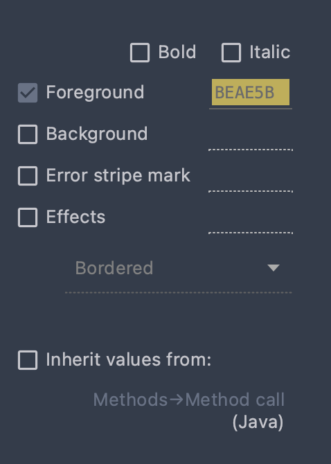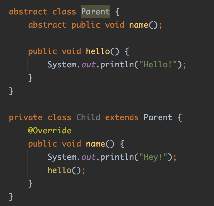 inherited method에 노란색 적용하기 나는 여기에서 주로 Language Defaults, Java, Java Additions 메뉴를 돌아다니면서 색깔을 지정했다. Java > Methods > inherited method의 디폴트는 흰색이지만, 나는 노란색을 줘서 구분했다. 설정을 적용하니 hello()가 노란색으로 구분이 되었다. 위 엉터리 예제에서는 별로 티가 안 나지만, 복잡한 회사 코드에서는 이렇게 구분을 해주니까 확실히 파악하는 데 도움이 된다. 아주 만족!